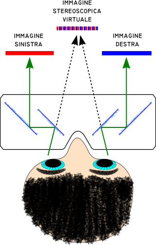 Supponiamo di disporre di fotografie stereoscopiche e di volerle osservare. (La supposizione è verosimile in quanto a questo link trovi molte foto stereoscopiche)- Se le coppie di foto sono di dimensione superiore alla distanza interpupillare (circa 65mm) avremo delle grosse difficoltà nel vederle poiché non siamo capaci di far divergere gli occhi. Un semplice modo per osservarle consiste nell'uso di uno stereoscopio a specchi il cui funzionamento è illustrato nella figura accanto.